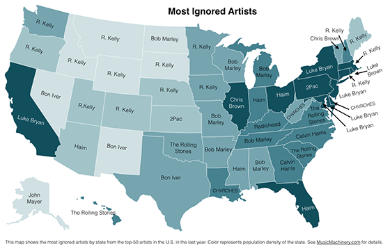 La carte a été établie en tenant compte des artistes généralement populaires aux États-Unis mais qui sont moins aimés dans une région en particulier.