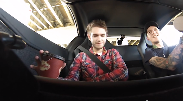 Zedd est incapable de répondre aux questions de Deadmau5 quand il accélère. On les voit coller dans les sièges si bien que Zedd doit garder son café dans ses mains pour ne pas qu’il renverse partout. Et preuve qu’ils sont au Canada : Zedd a un café Tim Hortons.