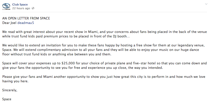 Hier, le Club Space, la salle où Deadmau5 avait joué le 1er janvier au soir, publie une lettre ouverte, comme quoi le club s’engage à payer 25 000$ à Deadmau5 pour que celui-ci revienne donner un concert gratuit à ses fans.
