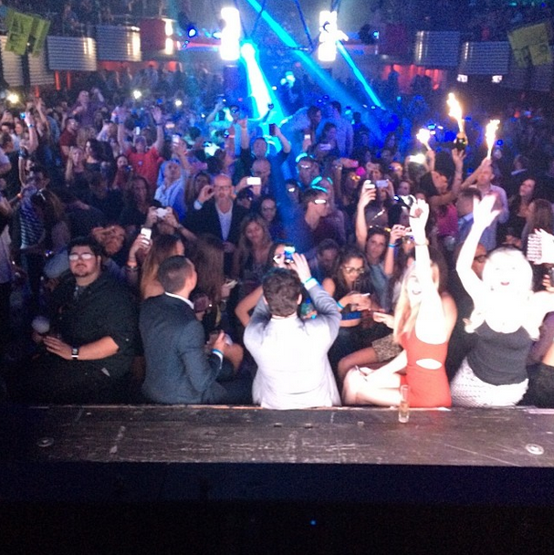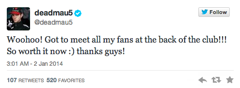 Lors du concert du 1er janvier, les VIPs, la première rangée au complet du concert de Deadmau5, est sur leurs cellulaires sans arrêt tandis que les vrais fans du DJ sont en arrière de la salle. C’est alors que Deadmau5 publie cette photo avec la mention “2 of the coolest dudes just chillin on the stage, texting n stuff. All good.”