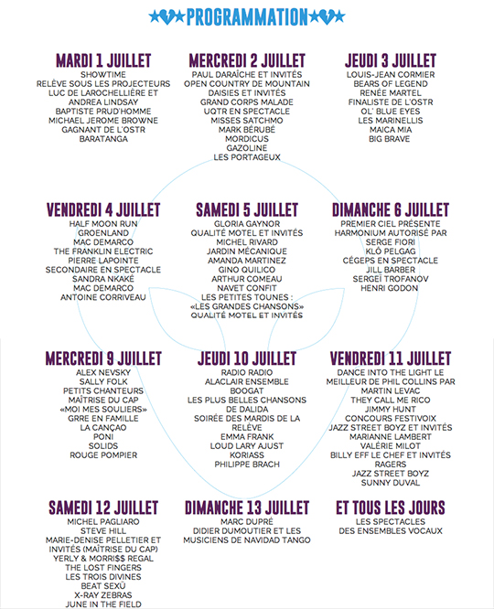 La 21e édition présentera, au total, 120 spectacles sur 13 scènes différentes. Le concert à ne pas manquer au FestiVoix 2014 est sans aucun doute la soirée indie-rock du 4 juillet avec Half Moon Run, Groenland, Mac DeMarco et The Franklin Electric.