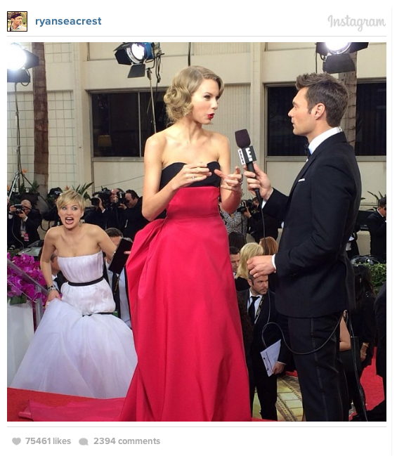 Même si les Golden Globes sont un gala qui récompense l’industrie du cinéma et ses acteurs, certains musiciens réussissent quand même à être présents au gala. C’est le cas de Taylor Swift, qui s’est fait faire un photobomb par Jennifer Lawrence.