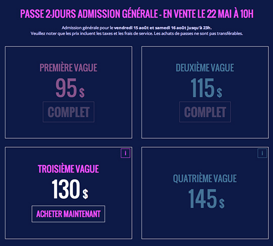 Les billets sont donc maintenant 130$ et, à voir le rythme des ventes, dépêchez-vous avant que cette vague soit également complète.