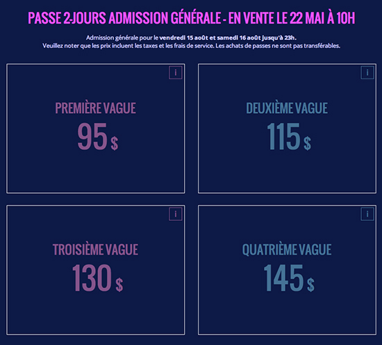 Les premiers laissez-passer sont disponibles à partir de demain, 22 mai, à 10h00, au prix de 95$. Ceci revient à moins de 50$ par journée. C’est très accessible quand on compare aux autres festivals d’Evenko (Osheaga et Heavy Montreal), où le prix par jour revient à plus ou moins 100$.