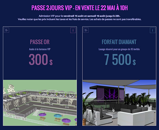 L’ÎleSoniq propose aussi 2 types de forfaits VIP. Le premier est un billet individuel à 300$ tandis que le deuxième est une banquette VIP pour 10 personnes qui se détaille à 7500$.