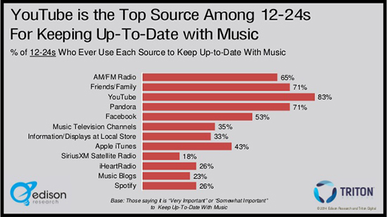 Par contre, quand on regarde les données des jeunes entre 12 et 24 ans, c’est Youtube qui arrive premier avec 83% suivi de Pandora et du bouche-à-oreille à 71% et la radio traditionnelle à 65%.