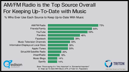Reste que c’est encore la radio qui domine. Rien n’est plus puissant pour découvrir de nouvelles chansons. 75% des Américains avouent que la radio est leur moyen de prédilection pour découvrir de la nouvelle musique tandis que 66% privilégient le bouche-à-oreille et 59% Youtube.