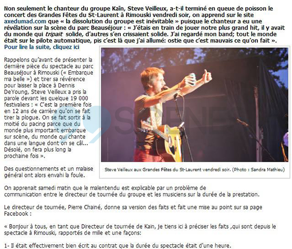 Depuis quelques jours, on parle beaucoup du show de Kaïn aux Grandes Fêtes du St-Laurent à Rimouski. Le chanteur du groupe, Steve Veilleux, a créé un malaise parmi la foule de 12 000 personnes avec ses commentaires déplacés. Ce qui nous intéresse dans l’histoire est le méga MÉDIA FAIL d’un journal de Rimouski.