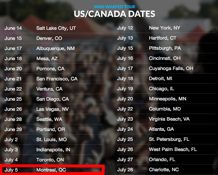 C’est ce que le Vans Warped Tour a confirmé sur son site internet alors que les dates de la tournée 2014 ont été annoncées. Et oui, Montréal est bel et bien présent, le 5 juillet 2014.