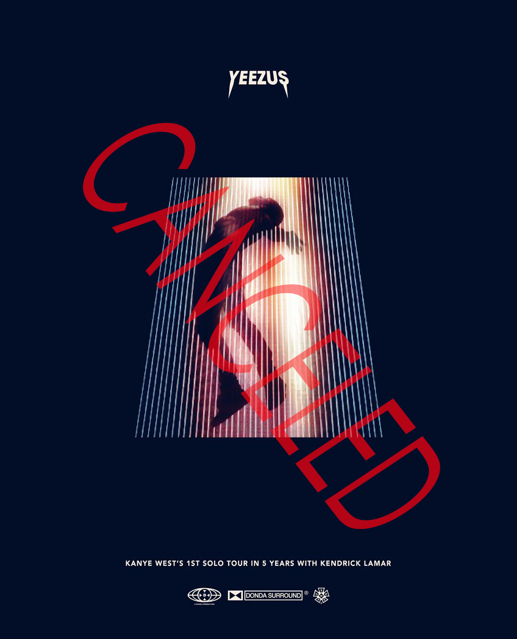La tournée a par la suite été suspendue quand un camion complet transportant l’équipement du Yeezus tour a eu un accident. Plusieurs pièces de matériels faits sur mesure pour la tournée de Kanye West ont été détruits comme un écran LED de 60 pieds et une structure de la scène.