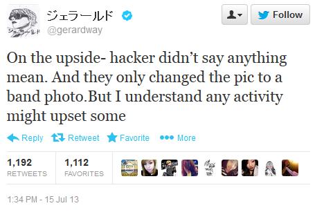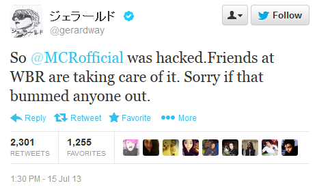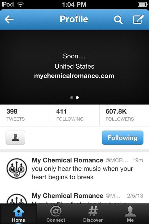 Et oui. Le compte Twitter du band My Chemical Romance s’est fait hacker dans les derniers jours. Les hackers on mis une nouvelle image ainsi qu’une description qui disais “Soon…”(bientôt). Ça laissait donc entrevoir un possible retour de My Chemical Romance. Mais Gerard Way a complètement nié la réunion du groupe.