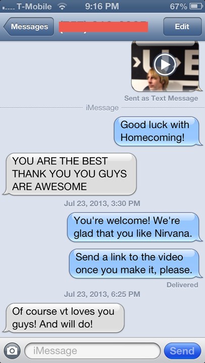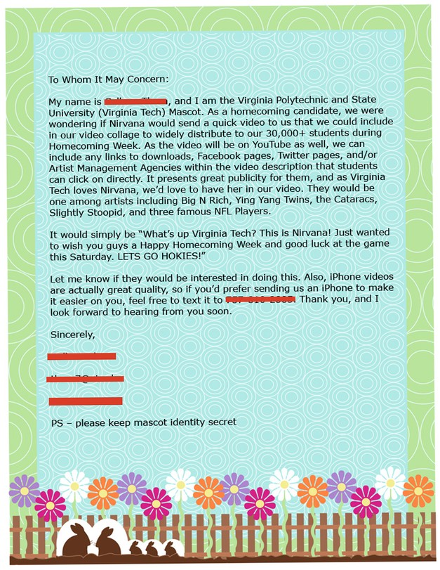 La lettre mentionnait aussi que ce serait une belle visibilité pour Nirvana puisque la vidéo serait distribué au 30 000+ étudiants du campus en plus d’être avec d’autres noms connus que Virginia Tech aime comme Big & Rich, the Ying Yang Twins et trois joueurs de la NFL très connus.