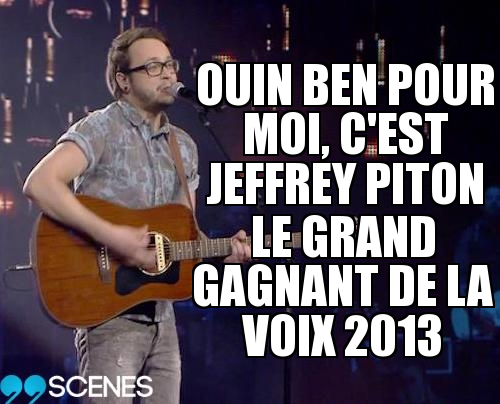 Vous comprendrez que le titre n’était qu’une blague. Dans les faits, c’est Valérie Carpentier qui est la grande gagnante de La Voix 2013. Par contre, à 99scenes, c’est Jeffrey Piton qui nous a le plus impressionné. Il est donc, pour nous, le gagnant de La Voix 2013. Best of de son aventure dans “lire la suite”.