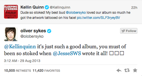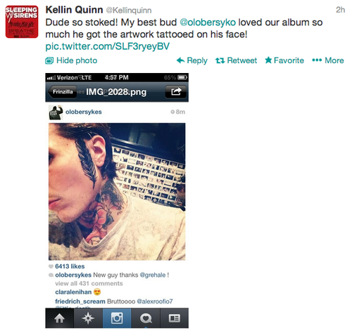 Le tout a commencé (en fait recommencé puisque Oliver Sykes avait déjà commenté les photos à 80$ de Kellin Quinn) quand Kellin Quinn a commenté le nouveau tattoo de Olivier Sykes :
