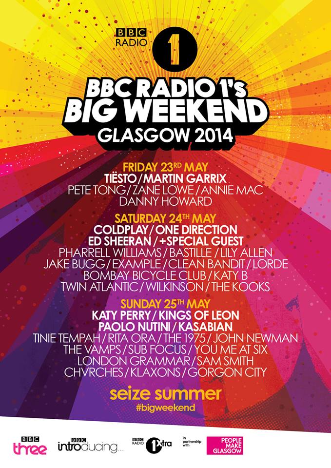 Le BBC Radio 1’s Big Weekend se tiendra les 23, 24 et 25 mai prochains à Glasgow, en Angleterre. Tiësto sera la vedette du vendredi, Coldplay sera la tête d’affiche de la journée du samedi alors que Katy Perry terminera celle du dimanche.