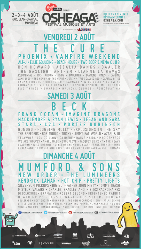 On avait déjà sorti l’horaire de quelques groupes pour Osheaga 2013 plus tôt au mois de mai. Les billets journaliers sont aussi disponibles dès maintenant. Faites vite si vous voulez voir Mumfords And Sons car c’est clair que c’est LA journée qui partira le plus vite.
