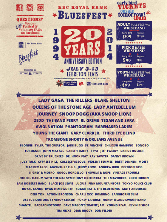 Le RBC Royal Bank Bluesfest 2014 a annoncé sa programmation 2014, aujourd’hui, avec des artistes comme Lady Gaga, The Killers, Blake Shelton, Lady Antebellum, Queens Of The Stone Age, Journey, Zedd et plusieurs autres. Ceci constitue peut-être un avant-goût du Festival d’Été de Québec 2014 alors que les feux festivals se tiennent aux mêmes dates.