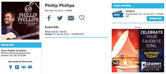 Même si aucun promoteur n’a annoncé la nouvelle pour l’instant, le site de billets axs.com valide aussi cette information alors qu’on peut voir la date de Québec à l’horaire de tournée de Phillip Phillips.
