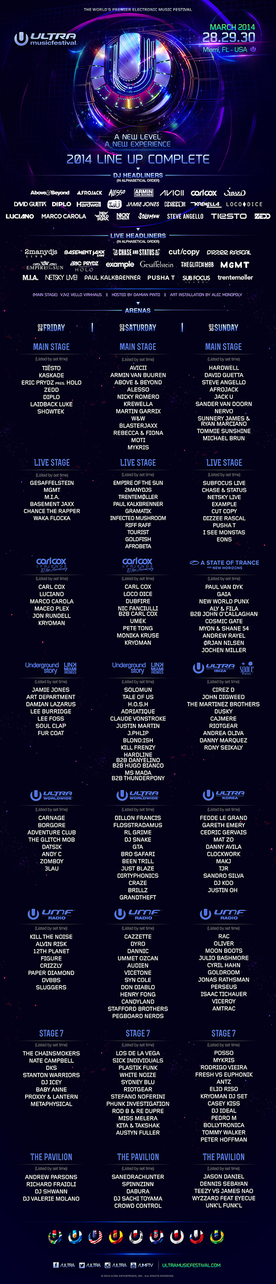 Le Ultra Music Festival se veut la version américaine de Tomorrowland (avant que TomorrowWorld arrive, l’année dernière). La programmation complète vient d’être annoncée et l’on retrouve les Avicii, Zedd, Hardwell, Tiesto, Steve Angelo et autres de ce monde.