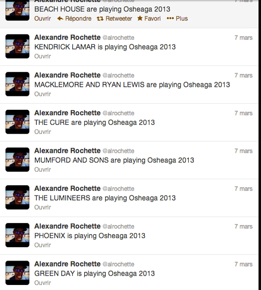 Ok, la résolution du print screen est mauvaise mais on peut clairement apercevoir Green Day entre The Cure et Mumford & Sons. Reste que, en 2013, avec Photoshop, c’est facile de faire des fausses répliques de flyers. Par contre, il y a quelqu’un qui a envoyé le flyer sur la page Facebook de Osheaga à 20h06. Quand même vite 6 minutes pour faire du Photoshop et le mettre en ligne.