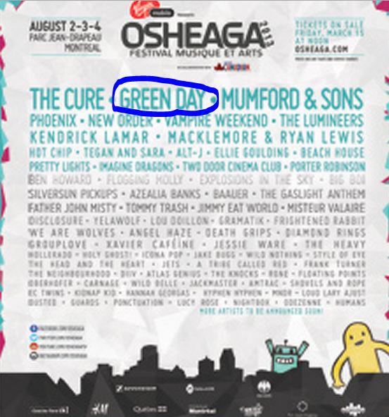Aussi, cette source (complètement indépendante de la notre) près de Osheaga avait confirmé plus de 10 groupes la semaine dernière. Bizarrement, tous les groupes annoncés y sont. Sauf un, Green Day.