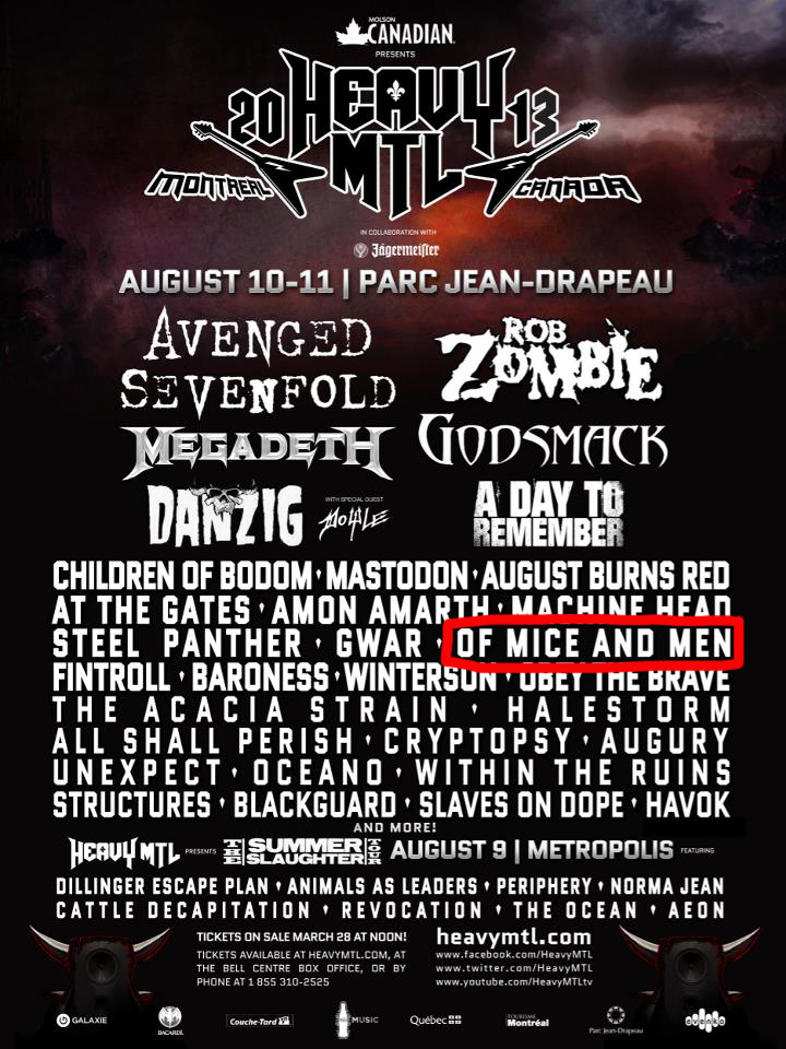 Quand on regarde l’horaire journalier du Heavy MTL, aucune trace de Of Mice & Men. Sur la page du site du Heavy MTL, il y a un flyer sans le nom de Of Mice & Men :