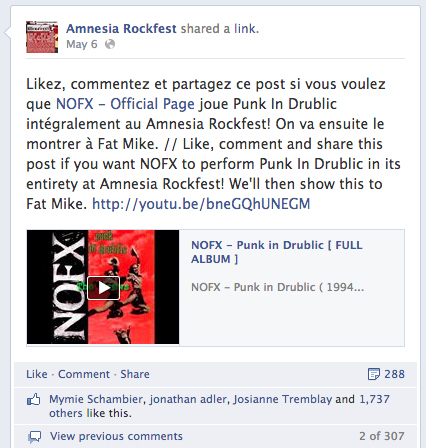 Disons qu’avec 1700+ mentions j’aime et 300+ commentaires, la réponse des fans du Rockfest a été assez claire. C’est, entre autres, ce qui aurait convaincu NOFX d’inclure le festival dans la liste des concerts de Punk In Drulic. On verrait donc les Linoleum, Don’t Call Me White, Reeko et autres être jouées à la marina de Montebello, en juin.