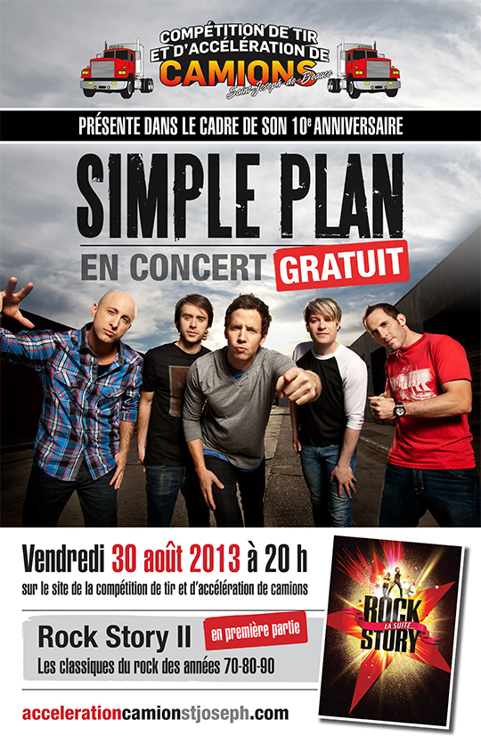 Simple Plan donnera un spectacle gratuit à St-Joseph de Beauce, le 30 août prochain, dans le cadre de la compétition de tir et d’accélération de camions. Il s’agit du 10e anniversaire de la compétition.