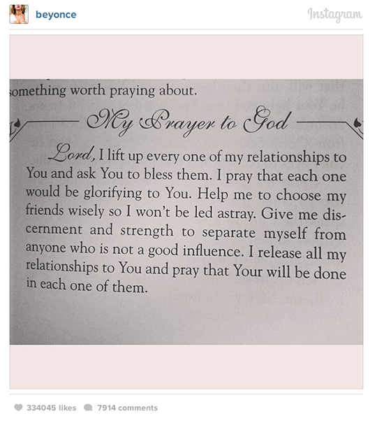 Beyoncé, du même coup, a publié aujourd’hui une prière sur son propre compte Instagram. On peut y lire qu’elle veut que Dieu l’aide à choisir ses amis précieusement et de se séparer de tous ceux qui ont une influence négative dans sa vie. Coïncidence? Probablement pas. Les deux soeurs avaient été réunies sur scène à Coachella, le mois dernier.