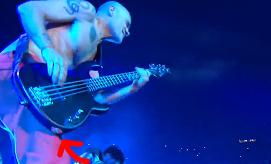 C’est du moins ce qu’on peut en déduire de cette photo du bassiste de RHCP, Flea, où l’on peut voir qu’aucun fil (pas même un wireless) n’est branché dans sa basse. On le voit clairement lorsqu’on est attentif à la prestation des Red Hot Chili Peppers :