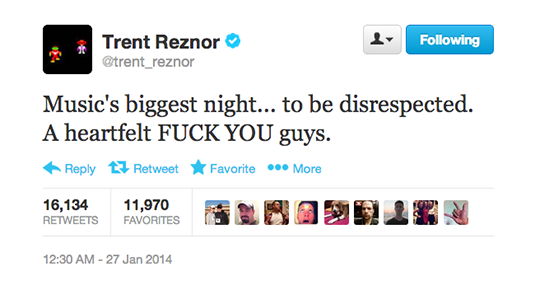Trent Reznor, le chanteur de Nine Inch Nails, devait terminer les GRAMMYs 2014 lors d’une finale rock avec Dave Grohl et le groupe Queens Of The Stone Age. La performance a été coupée par le générique et des annonces publicitaires, ce qui a choqué Trent Reznor. Il a ensuite envoyé chier les producteurs des GRAMMYs sur Twitter.
