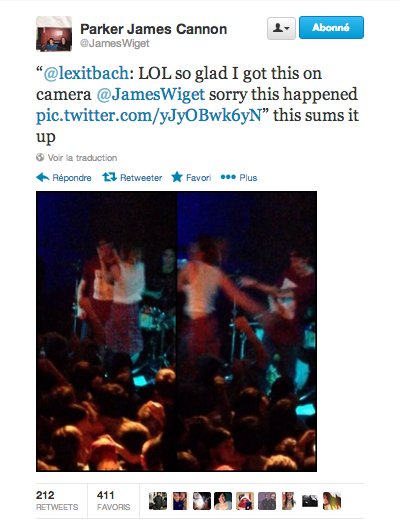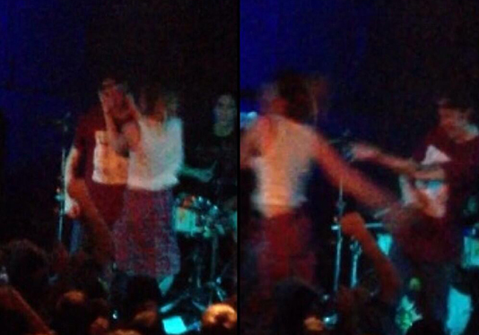 Les concerts pop-punk n’ont souvent pas de barrière entre la scène et le stage. C’était le cas lors du concert de Houston, samedi soir. La fan est montée sur la scène, comme si elle voulait faire un stage dive. Elle s’est par contre tournée vers le chanteur, Parker Cannon, qu’elle a embrassé directement sur la bouche.