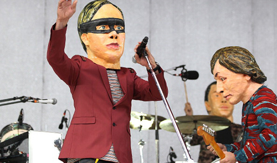 On peut voir le chanteur de The Strokes enlever la tête en papier mâché vers les 1min30.