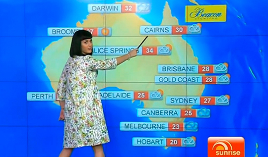 Katy Perry est présentement en Australie pour faire une série de concerts. Elle en a profité pour faire quelques entrevues promos. La station locale Sunrise l’a fait faire la météo et elle passe le test haut la main.