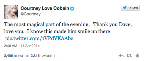 Dave Grohl et Courtney Love se sont aussi réconciliés. Ils se sont donné un gros câlin émotif et Love a par la suite tweeté qu’elle savait que ce geste avait fait sourire Kurt Cobain.