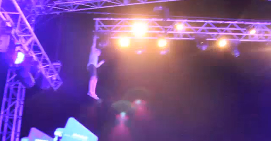 La vidéo donne des sueurs froides. On peut voir l’homme tomber de plusieurs mètres directement sur le sol, entre le stage et la foule.